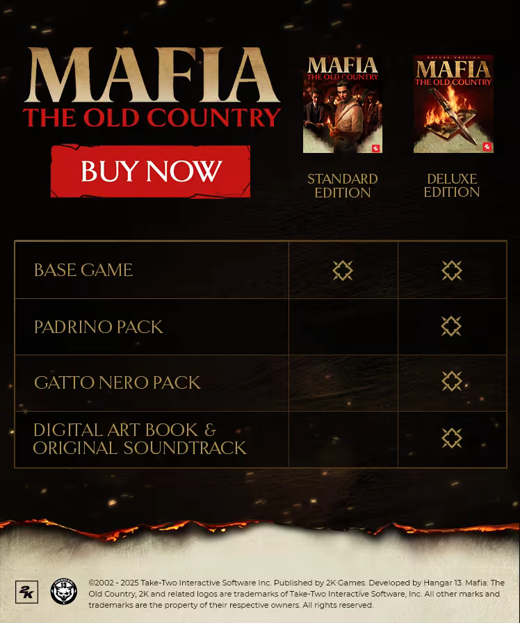 Mafia: The Old Country Deluxe Edition, koleksiyonuna özel bonus ögeler eklerken seni gerçek mafya tarzıyla Sicilya'nın suç dolu yeraltı dünyasına sürüklüyor.